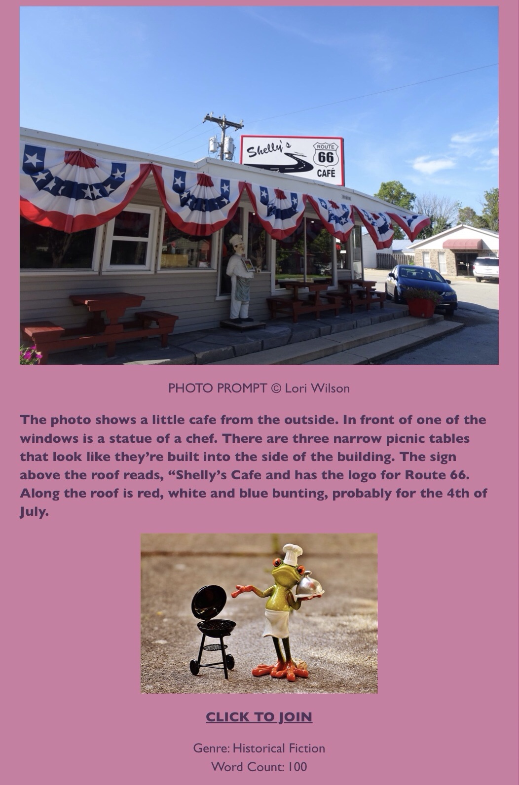 The chef in front beckons you to Shelly’s Cafe. She decided years ago to set up an establishment on the famous highway, Route 66. Every day of building, making sure the food supplies were delivered on time, the kitchen was immaculate and the servers well presented in the famous red and white uniforms. Every person who was employed by the famous chef had been screened for knowledge of the menus, polite behavior and how to make change as a cashier. That was in the fifties and has been a symbol of excellent service ever since. Route 66 is still famous.