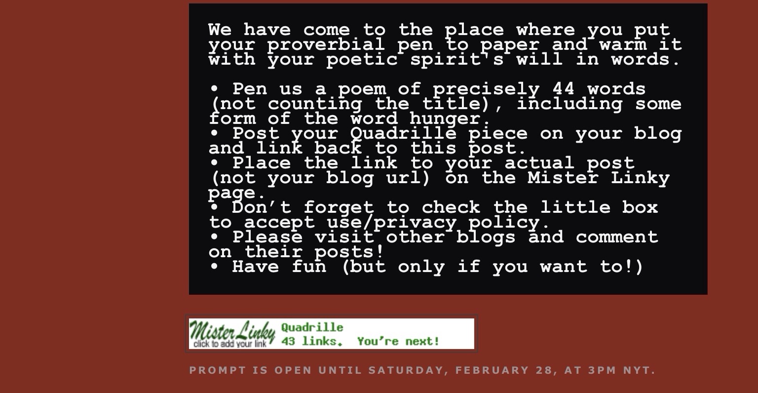 Appetite wanders listlessly Bread, the staple always provided Even in confinement they give you bread The thirst is the worst Dry mouths, tongue sticks to teeth Without water, hunger lessens But bread, water, just a crust Begging nourishment Death in starving Eases the pain