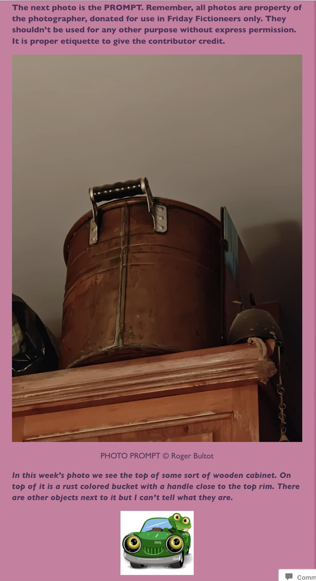 Susan looked up to the metal basket with fear, an old fear that now replayed in her brain, of old trips to the woodshed to fill the metal can with small pieces of wood. It was a scary errand. Grandmother knew how frightening it was for Susan, but still insistent on her doing the chore. In the woodshed hung huge hairy spiders, sitting on their ancient webs, hoping for a fly or bee for their next meal. Susan had an inordinate fear of spiders in general, even tiny ones inside the house. Seeing the container, she couldn’t help but shudder.