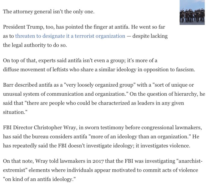 The US government’s use of “antifa” is a buzzword, just like Fake News, designed to trigger their base. I read the most hilarious article the other day about How to Tell If Your Grandparent is Antifa: https://www.washingtonpost.com/opinions/2020/06/10/know-signs-how-tell-if-your-grandparent-has-become-an-antifa-agent/