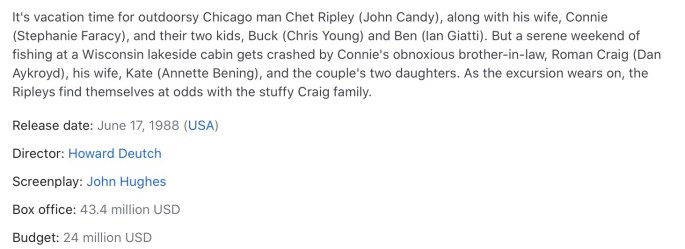 John Candy and Dan Ackroyd, a favorite comedy duo, made “The Great Outdoors” movie in 1988. I miss seeing them and sadly, John Candy passed away in 1994. They made many comedy films together and I enjoyed them all. My favorite scene is John being chased by a bear, but my advice is watch the movie and decide for yourself.