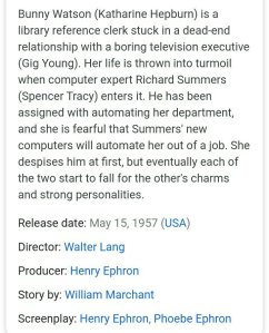 I think you are probably tired of movies by now, especially the repeats of popular ones and my thinking is, take a trip into the oldies. Today I offer a dip into the 50’s with Spencer Tracy and Katherine Hepburn’s “Desk Set”. I don’t think you’ll be disappointed but my usual caveat applies😉.