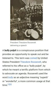 Funny coincidence the word boorish because as I was reading the news reports of Trump planning to send “federal troops” to cities to “handle” situations, bully pulpit came to mind. In my thinking it is a way to incite more violence, but I looked up the term “bully pulpit” which is being morphed by Trump. I grew up thinking both Presidents Roosevelt were admirable. Trump has taken an historical phrase and twisted its meaning, and demonized it. His actions in the past and present have proved **he is a bully and racist. As usual, just my opinion.