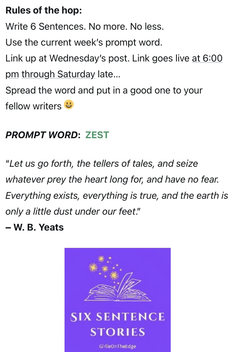 “He certainly has the zest for life”, the nursing home continuum decided. They all wished they could dance the swing with the friendliest nursing home attendants, but sadly that was not to be. Dyed red grey haired ladies always wore their finest dress or sparkled shawl to these Sunday night parties. Bent over men with canes tapped along to the beat, possibly remembering their old dancehall days. A few of the more able bodied Alzheimer victims dizzily twirled on their own, happy in their secreted minds. The zest for life need not be physical.