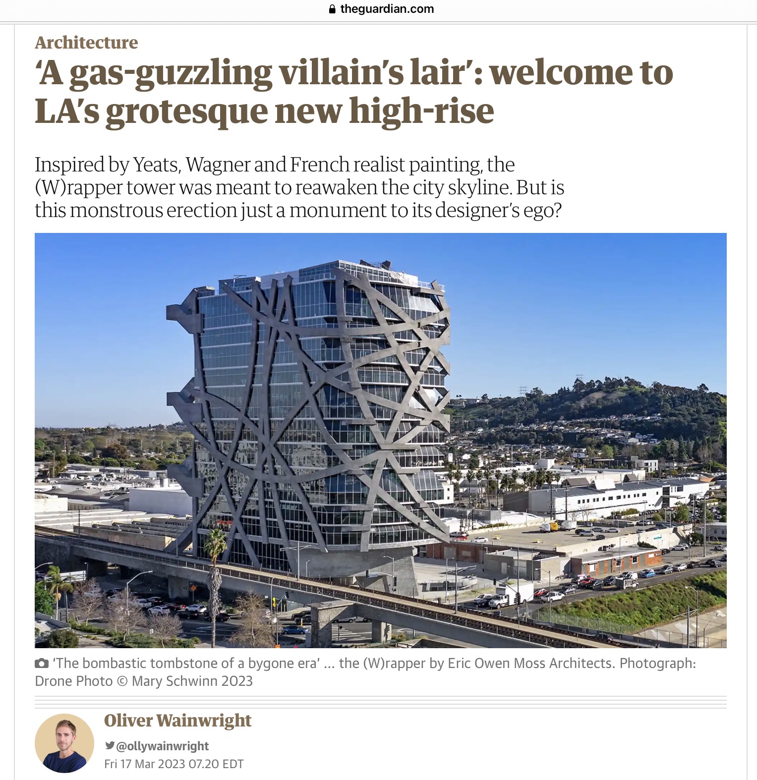 “A chunky grey staircase thrusts out from the side of a new office tower in Los Angeles, lunging towards a rail line before jerking back on itself and lurching up the building in jagged twists and turns. It crashes into a warped lattice of bands that wrap around the glassy hulk, swooping past corner windows that jut in and out like broken teeth. This is (W)rapper, “an outrageous creative office tower”, in the words of its leasing agents, set to “reawaken the Los Angeles skyline”. It is also the bombastic tombstone of a bygone era, a carbon-guzzling monument to a time when architectural ego trumped the interests of people and planet.”