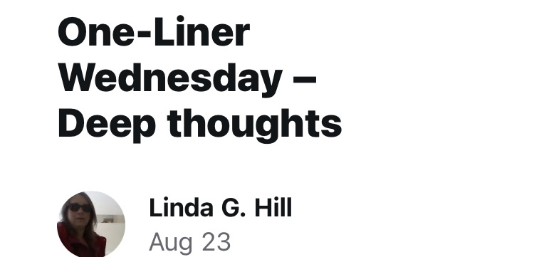 One Liner Wednesday August 22, 2023August 23, 2023 by rugby843, posted in Uncategorized 🥠Fortune cookie wisdom!🥠*** http://lindaghill.com/2023/08/23/one-liner-wednesday-deep-thoughts/ Email a link to a friend (Opens in new window) Email Like Loading... Related