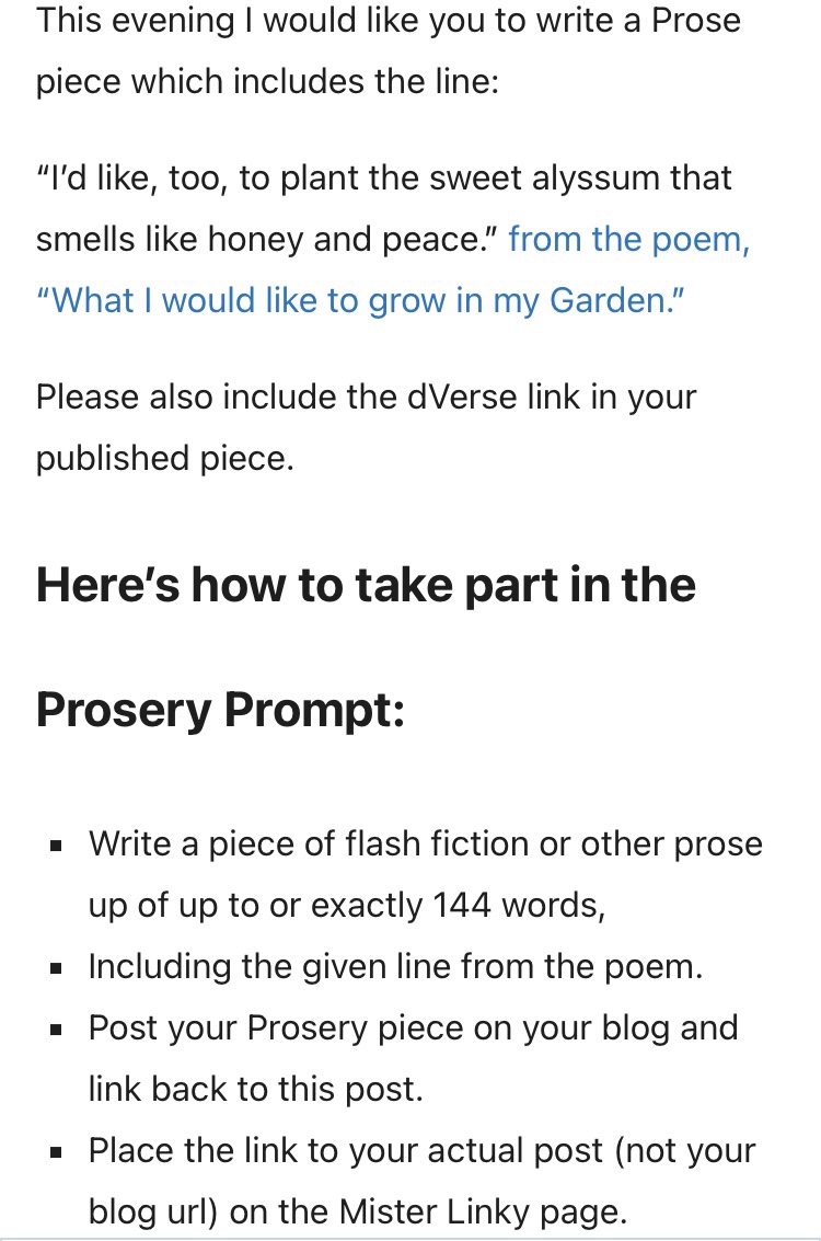 I suggest that gardening is a worthy task that other rewards cannot achieve. Provisions sitting on your dinner table or the scent of a peony blossom filling the home can bring a feeling of contentment, accomplishment and joy. Maybe gardening is the plausible answer, keeping hands and minds busy without ever present technology. I’d like, too, to plant the sweet alyssum that smells like honey and peace.