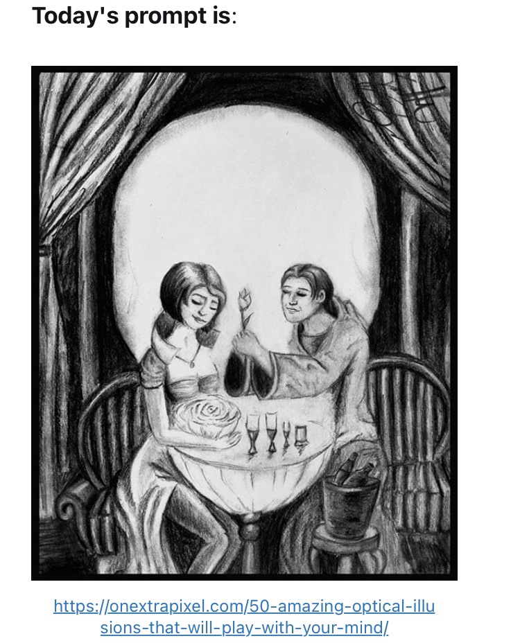 His meager offering went unnoticed as her arms encircled a much larger flower. The fact such a huge rose bloom was incredible, she still could not take her eyes from it. And him, being the sorry sap portrayed here also ignored the illusion the skull had made, his lovelorn vision only for her face. The skull resisted a smile as he enjoyed the conundrum he created. A woman’s dream brought to life and a man’s naivety revealed.