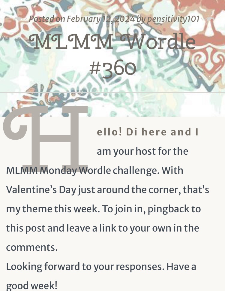 MLMM Wordle February 12, 2024 by rugby843, posted in Uncategorized Who can say one’s destiny consists of two hearts or that love must first be a cliche of flowers and future happy promises? You might as well say “I believe in Hallmark and buy a card of poetry, and that is a beginning to a true love”. MLMM Wordle #360 Email a link to a friend (Opens in new window) Email Like Loading... Related