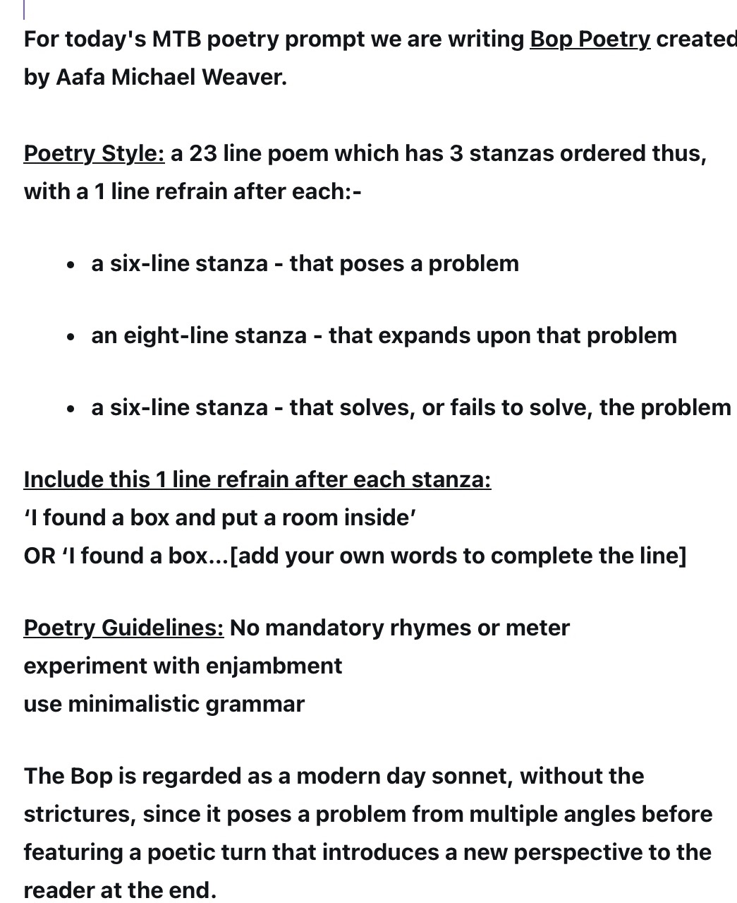 for accuracy the Bop poetry style has none and the refrain is an exact repeat