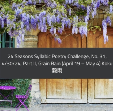 24 Seasons Syllabic Poetry Challenge, No. 32, 4/30/24, Part II, Grain Rain (April 19 – May 4) Koku 穀雨