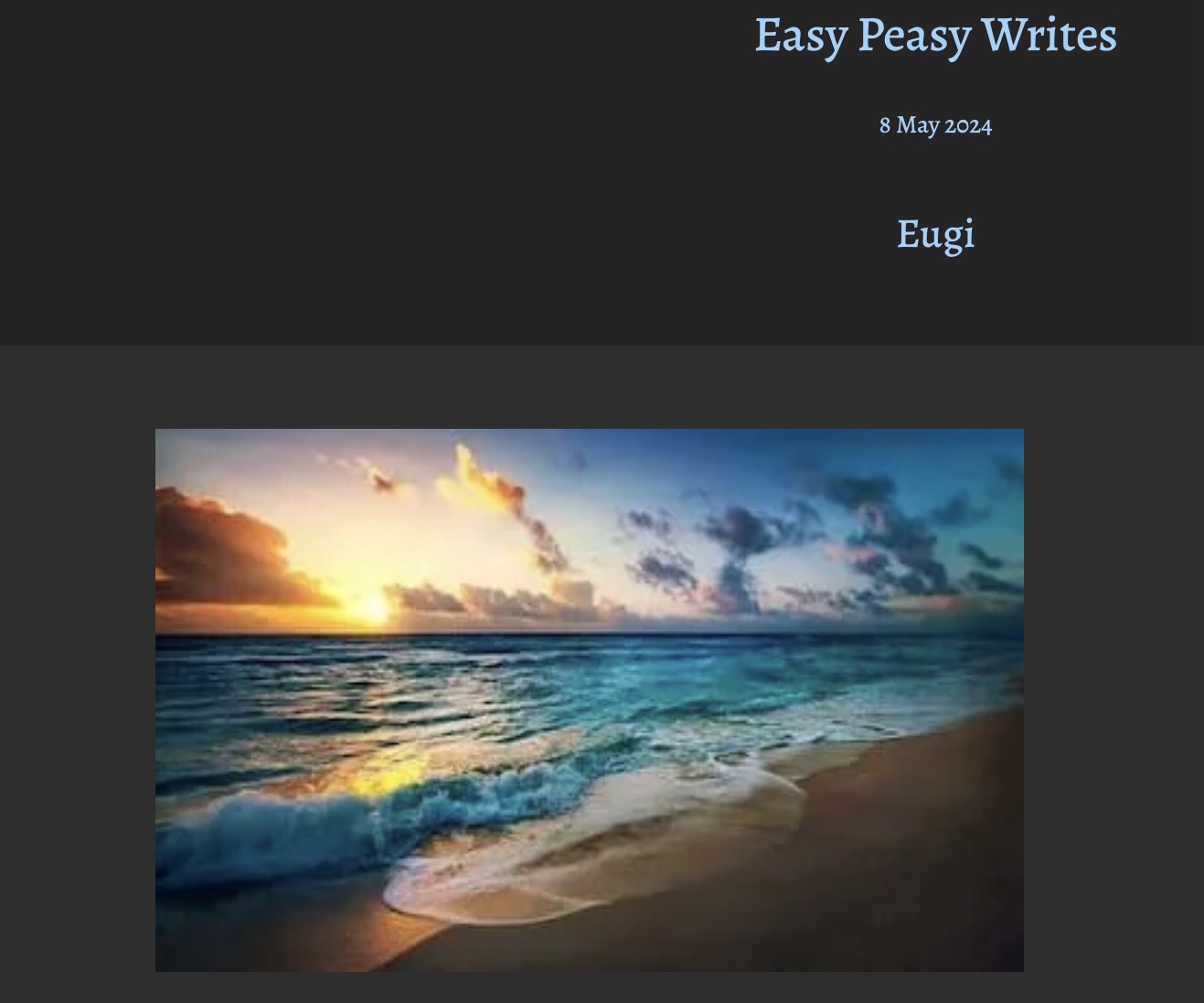 Easy Peasy Writes May 9, 2024 by rugby843, posted in Uncategorized turquoise waves lap black sand beaches sun lingers *** Easy Peasy Writes Click to email a link to a friend (Opens in new window) Email Like Loading... Related