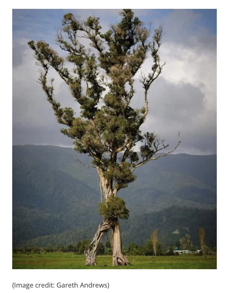 The tree stands alone in the middle of a large paddock next to a cemetery near Karamea on the west coast of South Island. It is around 105 feet (32 meters) tall — around the same height as a seven-story building, according to The New Zealand Tree Register.