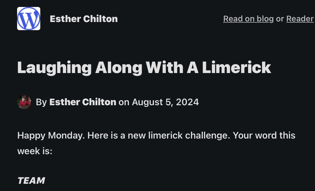 Limerick Time August 5, 2024 by rugby843, posted in Uncategorized Joe Schmo had a mighty dream To star on a football team Task never to meet Having two left feet Frustration caused him to scream *** Laughing Along With A Limerick Click to email a link to a friend (Opens in new window) Email Like Loading... Related