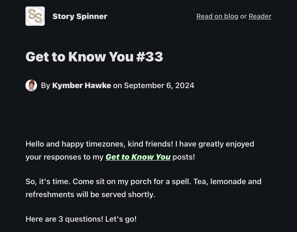 Get to Know You #33 September 6, 2024 by rugby843, posted in Uncategorized I did the sorting hat and it’s Ravenclaw. Sense of humor? Terms of Endearment *** Get to Know You #33 Click to email a link to a friend (Opens in new window) Email Like Loading... Related