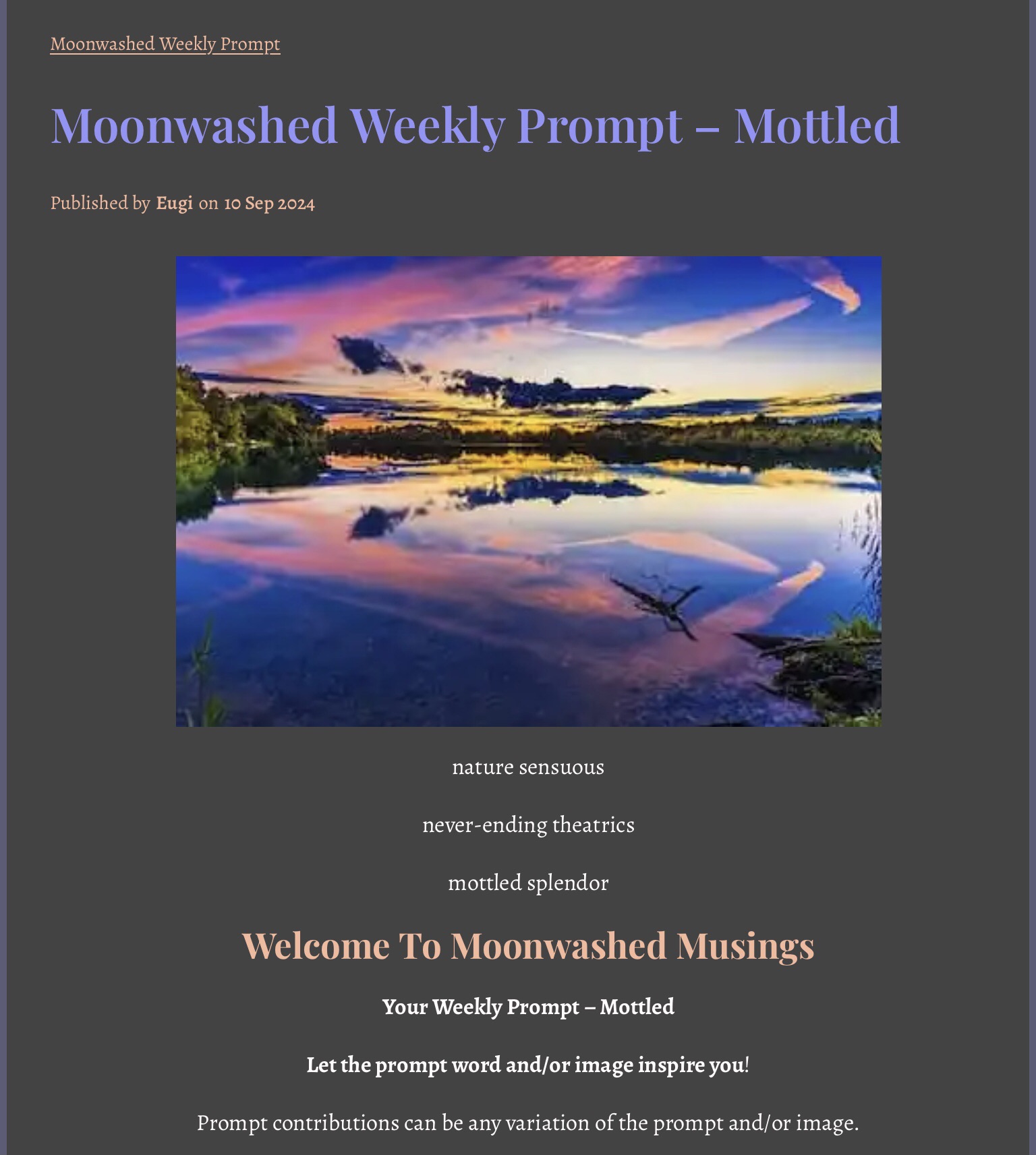 Moonwashed Prompt September 11, 2024 by rugby843, posted in Uncategorized streaked sky reflected mottled colors from no palette knife Mother Nature needs none, she commands the wind and the sunset hues relent *** Moonwashed Weekly Prompt – Mottled Email a link to a friend (Opens in new window) Email Like Loading... Related