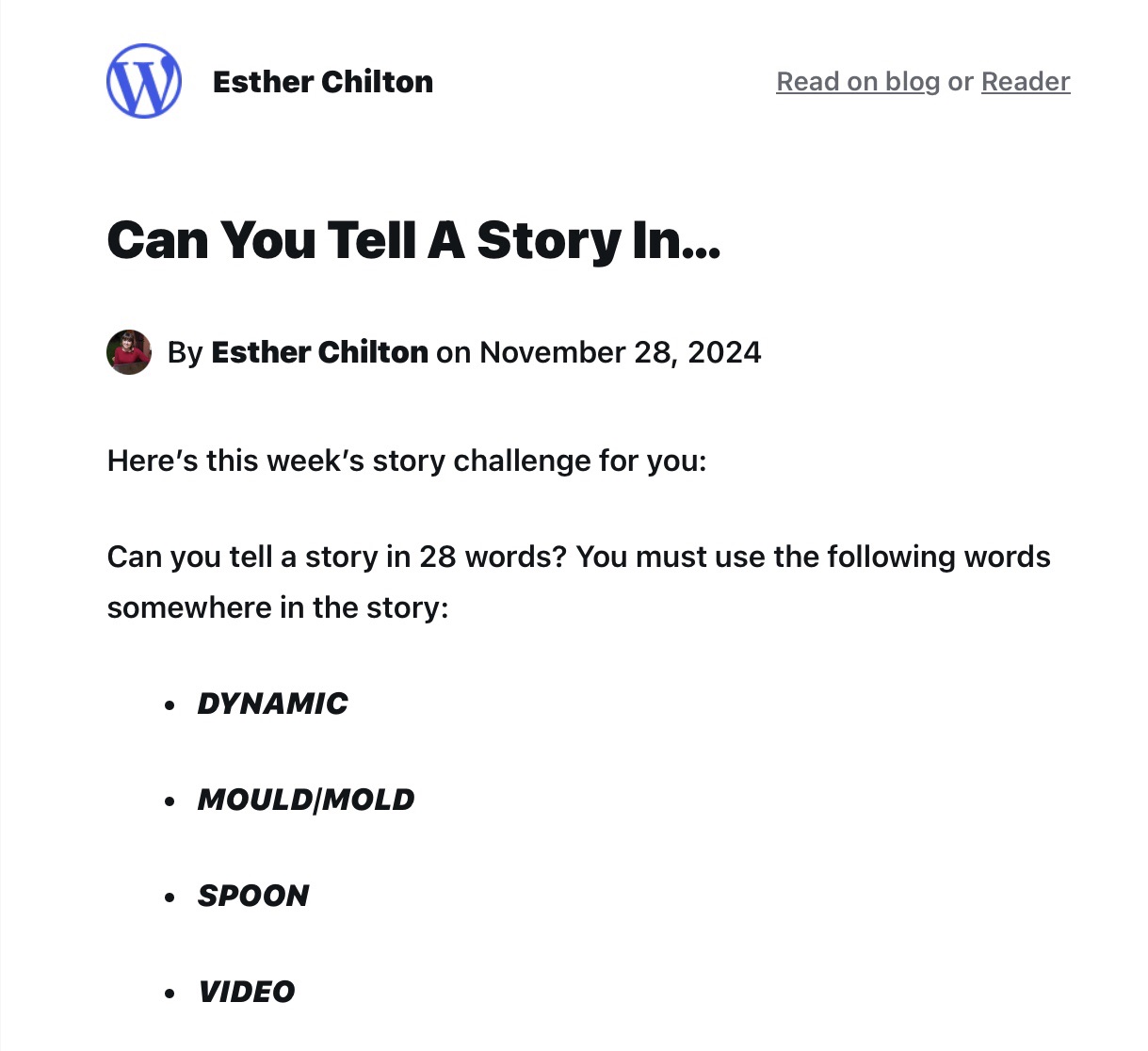 Can You Tell a Story in 28? November 28, 2024 by rugby843, posted in Uncategorized Sara was watching a dynamic cooking video when her spoon accidentally fell into the jello mold. She knew better than to cook and watch tv! Thanksgiving was ruined! *** Can You Tell A Story In… Click to email a link to a friend (Opens in new window) Email Like Loading... Related