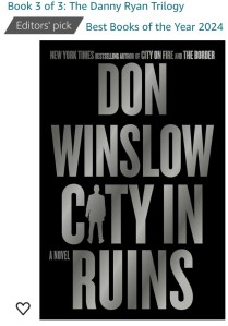 I just started the third book in Don Winslow’s City series with character Danny Ryan. All of Don Winslow’s books I have enjoyed in Audible. I started with “The Dawn Patrol” and have read it a few times, also a favorite main character, Boone Daniels. I wish there were more of Daniels’ ongoings, but that series was published in 2009, so probably not. I have read his cartel series which has opened my eyes to the drug trade and more. I highly recommend this author.