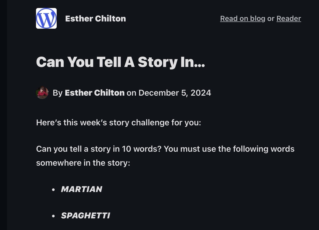 Can you tell a Story in 10? December 5, 2024 by rugby843, posted in Uncategorized *** The space travelers eating dinner: “This Martian spaghetti’s not bad!” *** Can You Tell A Story In… Click to email a link to a friend (Opens in new window) Email Like Loading... Related