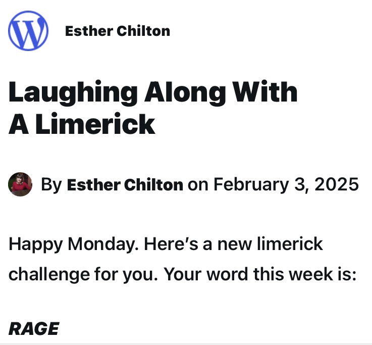 Limerick Time February 5, 2025 by rugby843, posted in Uncategorized Joan’s appearance started to age Joan decided to change her ways She went to a doc To turn back the clock Heard it was too late caused a rage *** Laughing Along With A Limerick Click to email a link to a friend (Opens in new window) Email Like Loading... Related