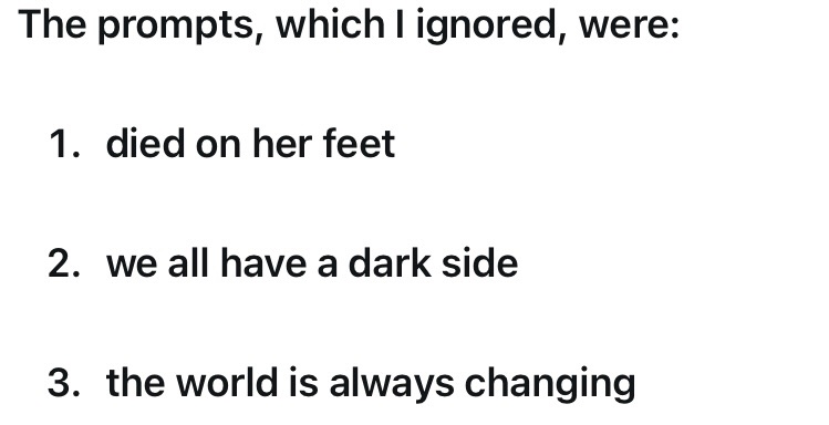 1. They’ll catch Harold. They always do. I like the story you wove with these somewhat disparate prompts. Well done. You always do well. Thanks