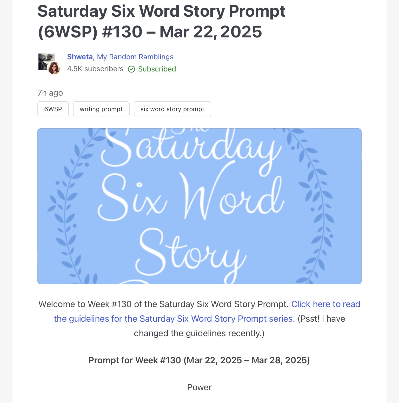 Saturday Six Word Story March 22, 2025 by rugby843, posted in Uncategorized *** Not even kings have absolute power. https://wordpress.com/reader/feeds/39694222/posts/5605511055 Click to email a link to a friend (Opens in new window) Email Like Loading... Related