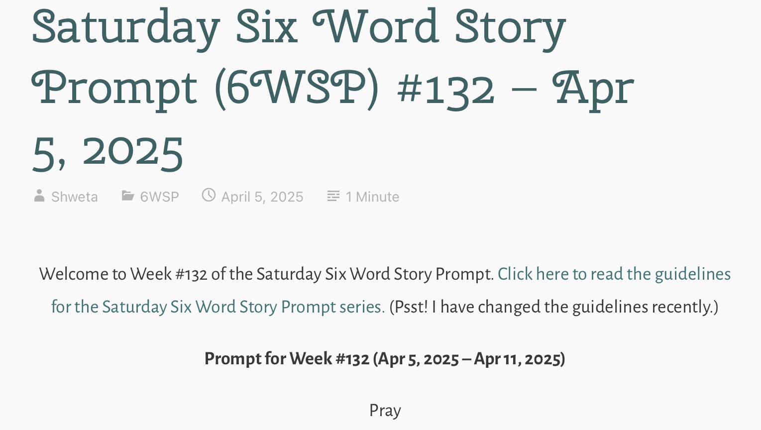 SSWSP April 5, 2025 by rugby843, posted in Uncategorized For those who believe, yes pray. Saturday Six Word Story Prompt (6WSP) #132 – Apr 5, 2025 Click to email a link to a friend (Opens in new window) Email Like Loading... Related