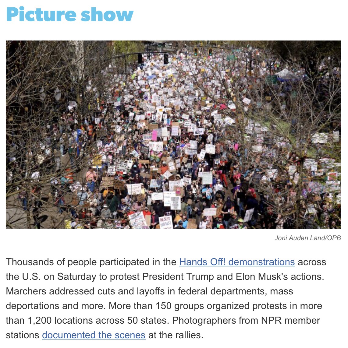 People are Acting! April 7, 2025April 7, 2025 by rugby843, posted in Uncategorized https://www.npr.org/ *** Hands Off! https://rugby843.blog Click to email a link to a friend (Opens in new window) Email Like Loading... Related