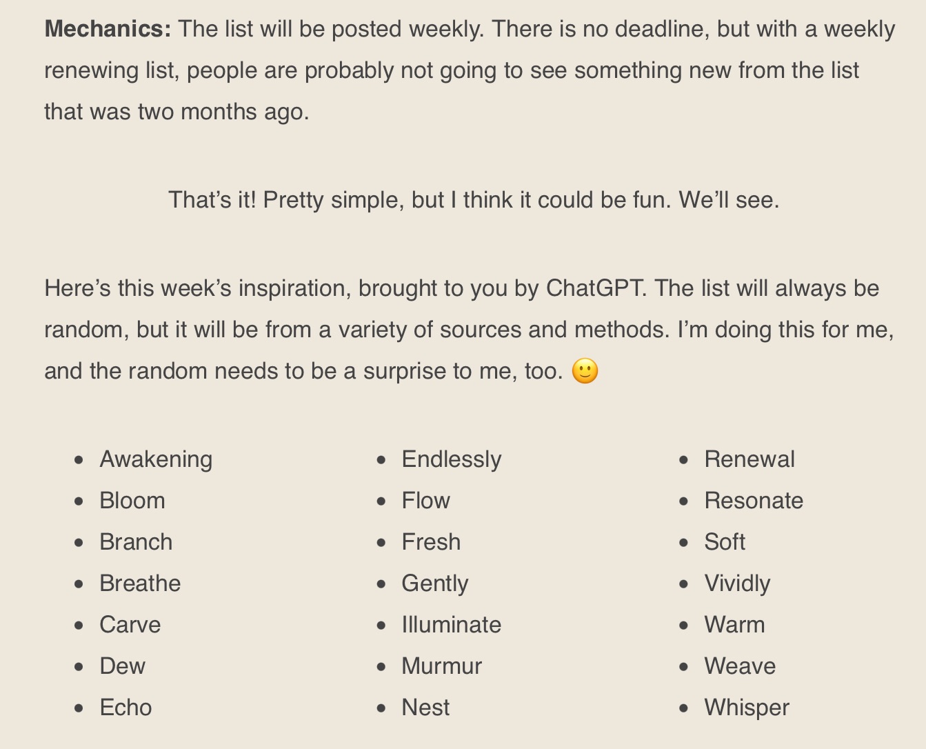 Good one Cheryl. I’ve picked this up from you and joined in too!