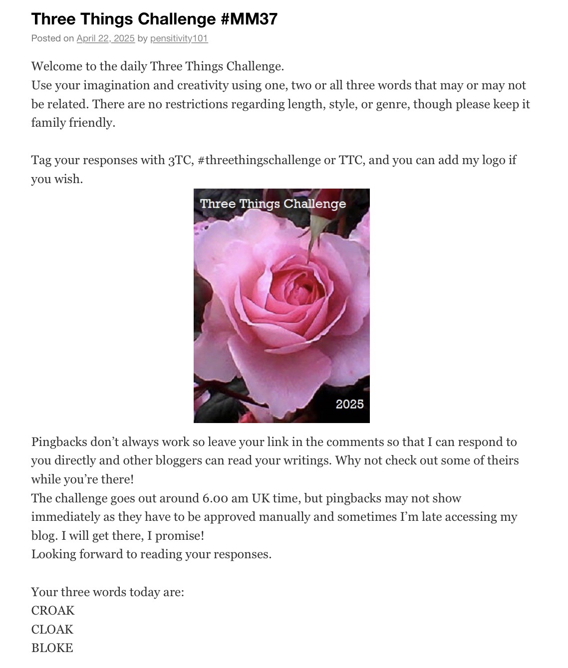 The old man’s voice was just a croak. He was of course a homeless bloke. A rich looking man was passing by. The old man gave a big sigh. The passerby asked if he needed a cloak, and the old man started to cry. “Oh yes, please”, he pleaded, “thank you kind sir”.