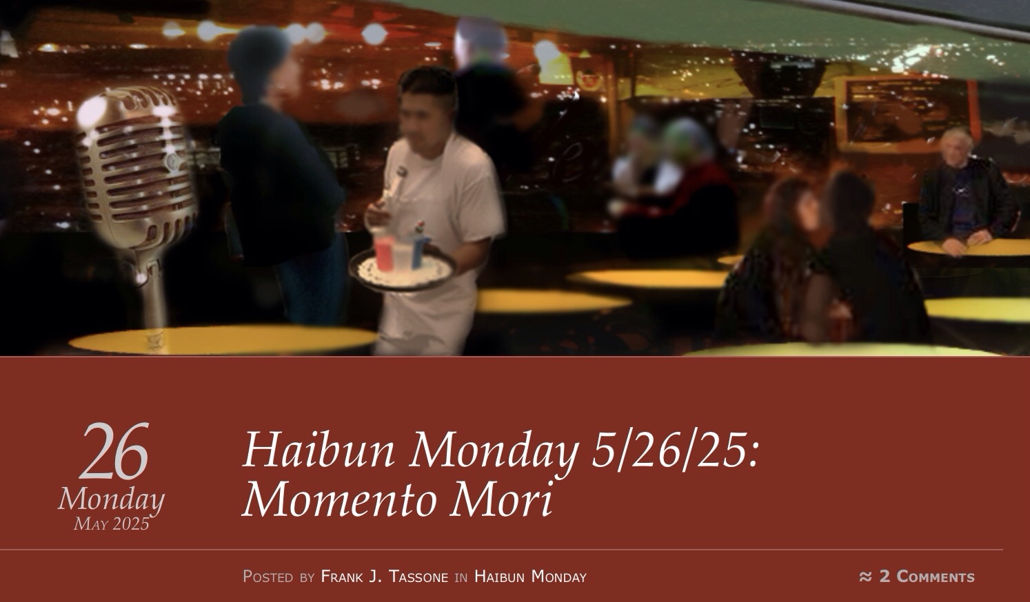 This Memorial Day, let us live the ancient Romans’ “Momemto more” by remembering our beloved dead. Write a haibun in which you offer your remembrance for anyone who has died, whom you love, or with whom you have a connection.