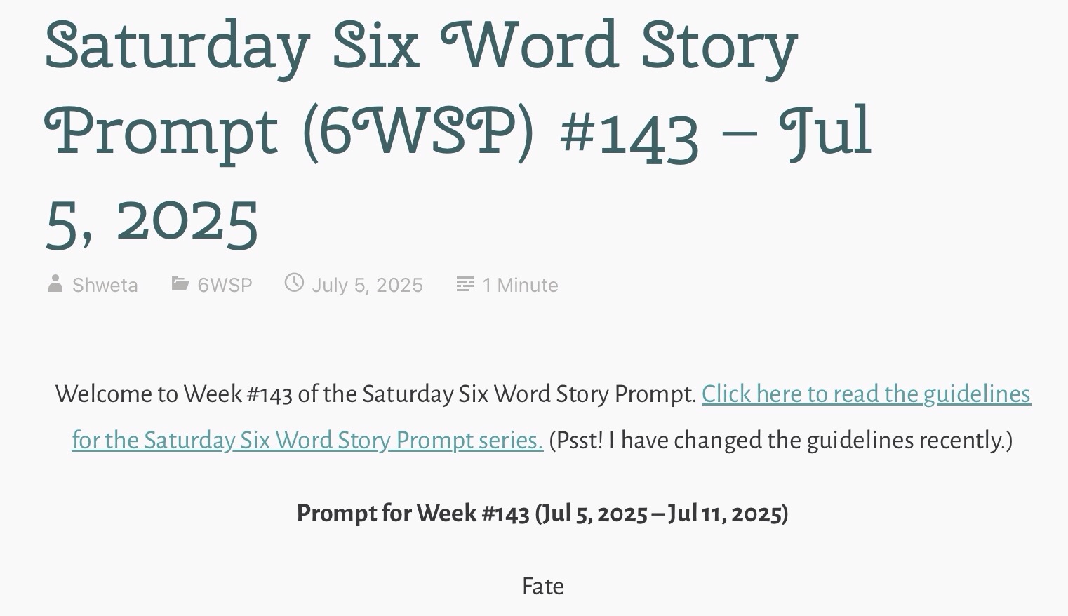 6WSP 7-5-25 July 5, 2025 by rugby843, posted in Uncategorized *** Dropped fattening French fries plate – fateš Saturday Six Word Story Prompt (6WSP) #143 – Jul 5, 2025 Click to email a link to a friend (Opens in new window) Email Like Loading... Related