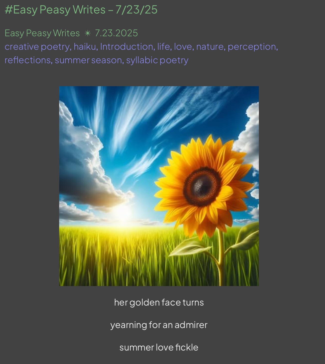 Easy Peasy Writes July 24, 2025July 24, 2025 by rugby843, posted in Uncategorized *** clouds parting sun seeking blossom summer scene *** My words for the photo☺️ *** #Easy Peasy Writes – 7/23/25 Click to email a link to a friend (Opens in new window) Email Like Loading... Related