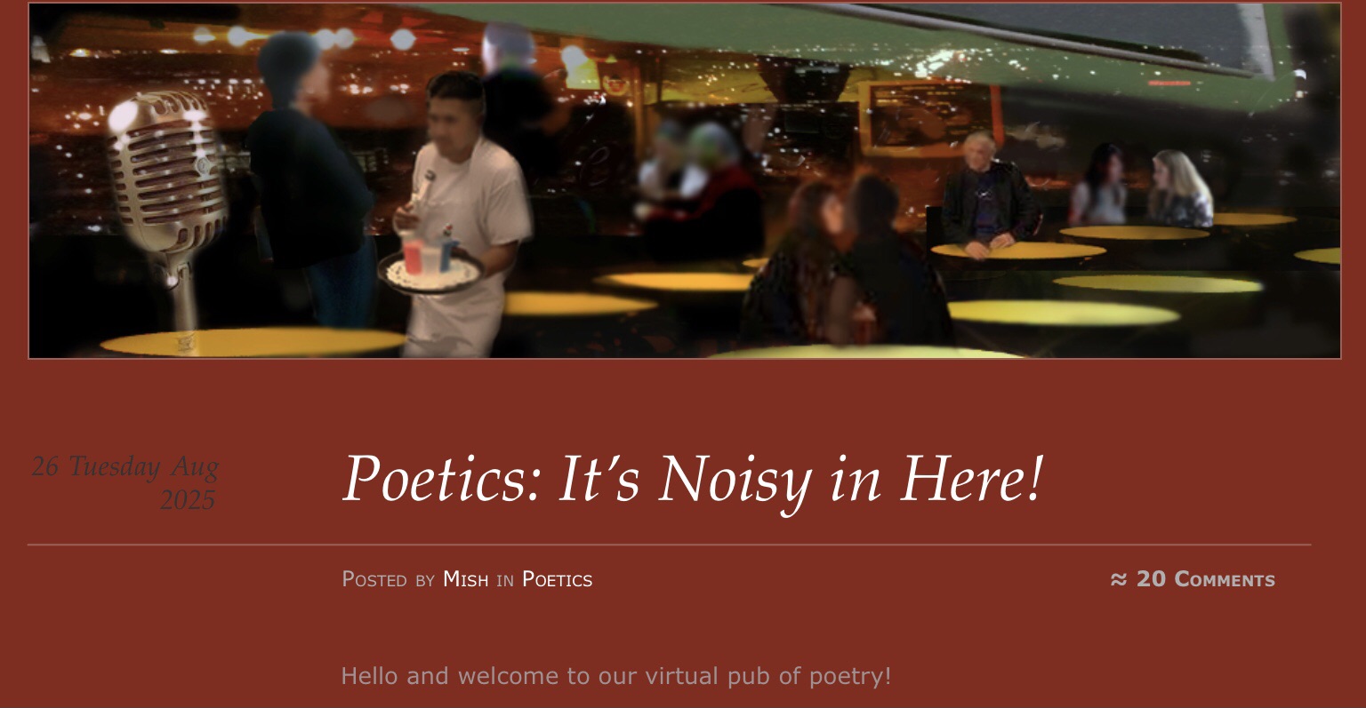 What do you consider to be noise pollution? Is there a buried emotion screaming to be heard? What noises give you joy? Sorrow? Bring us the noises of nature or a noise you find most irritating. Maybe there’s a sound of nature that you find irritating. I won’t judge! Fill your poem with noise to paint us a picture of an event. Use noise metaphorically to express turmoil or unease, whether internal or external. You can play with onomatopoeia in your poem if you’d like but it is not required.
