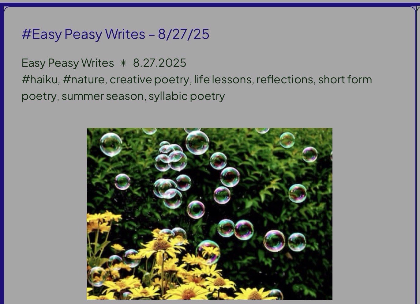 Easy Peasy Writes August 28, 2025 by rugby843, posted in Uncategorized bubbles risequiet daisies reachbright flowers scenery competes bubbles win *** #Easy Peasy Writes – 8/27/25 Click to email a link to a friend (Opens in new window) Email Like Loading... Related