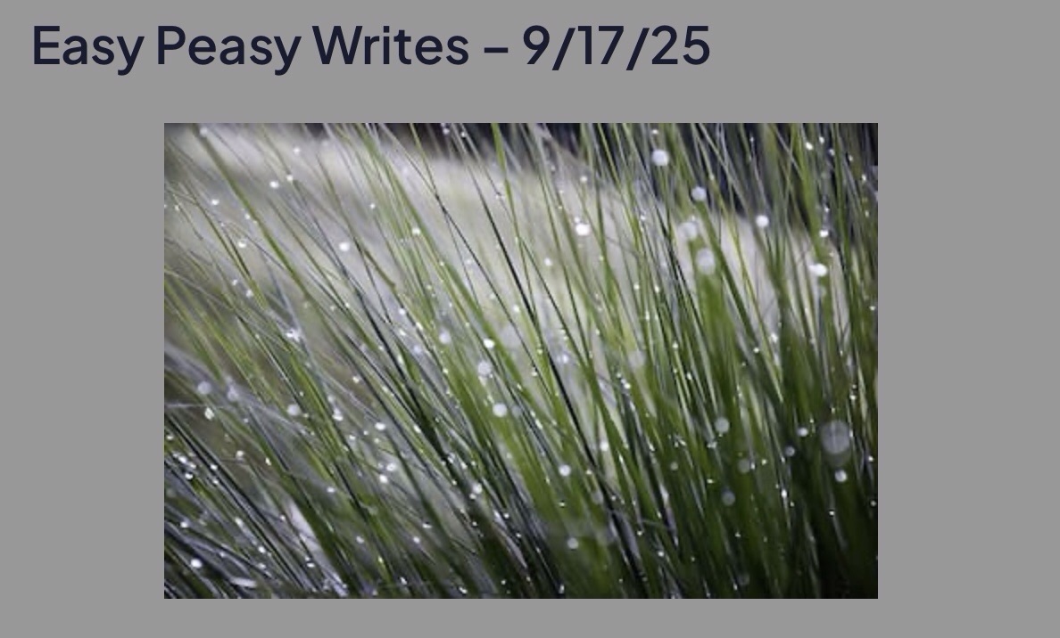 Easy Peasy Writes September 19, 2025 by rugby843, posted in Uncategorized *** slivers of green grass frosted by autumn raindrops cool bathing from sun *** Easy Peasy Writes – 9/17/25 Click to email a link to a friend (Opens in new window) Email Like Loading... Related