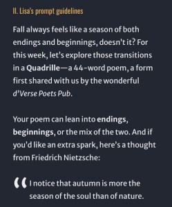 This is a lovely poem. I especially like the line “leaves changing from green to brown falling from wooded stems.” Very beautiful xoxo