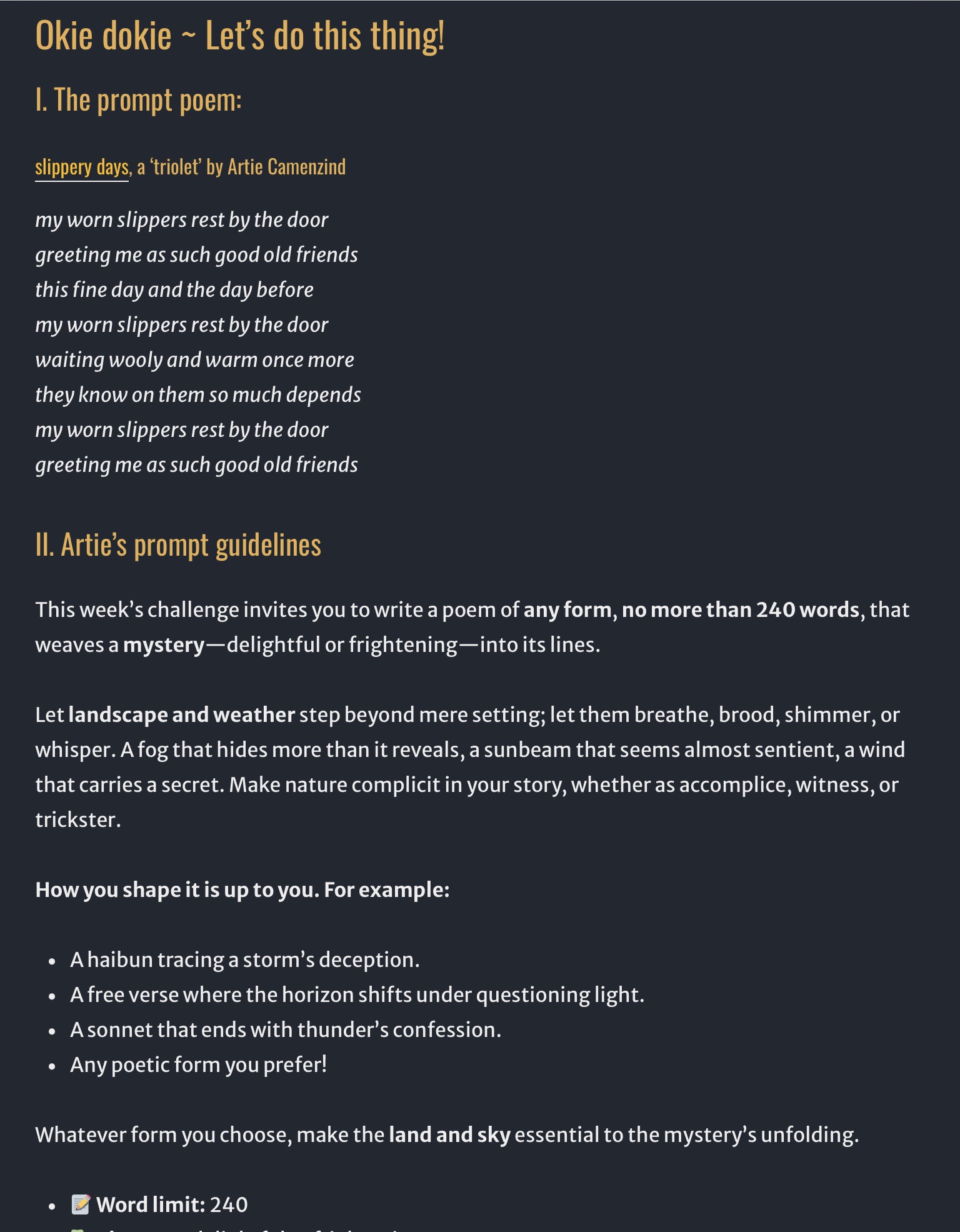 A tanka, 5,7,5,7,7, and a dectina refrain, 1,2,3,4,5,6,7,8,9 syllables. Line ten is a combination of the first four lines in quote form.