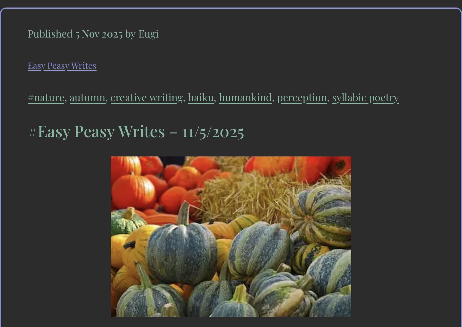 Easy Peasy Writes November 5, 2025 by rugby843, posted in Uncategorized humble pie striped or plain old hues vegetable prize *** #Easy Peasy Writes – 11/5/2025 Click to email a link to a friend (Opens in new window) Email Like Loading... Related