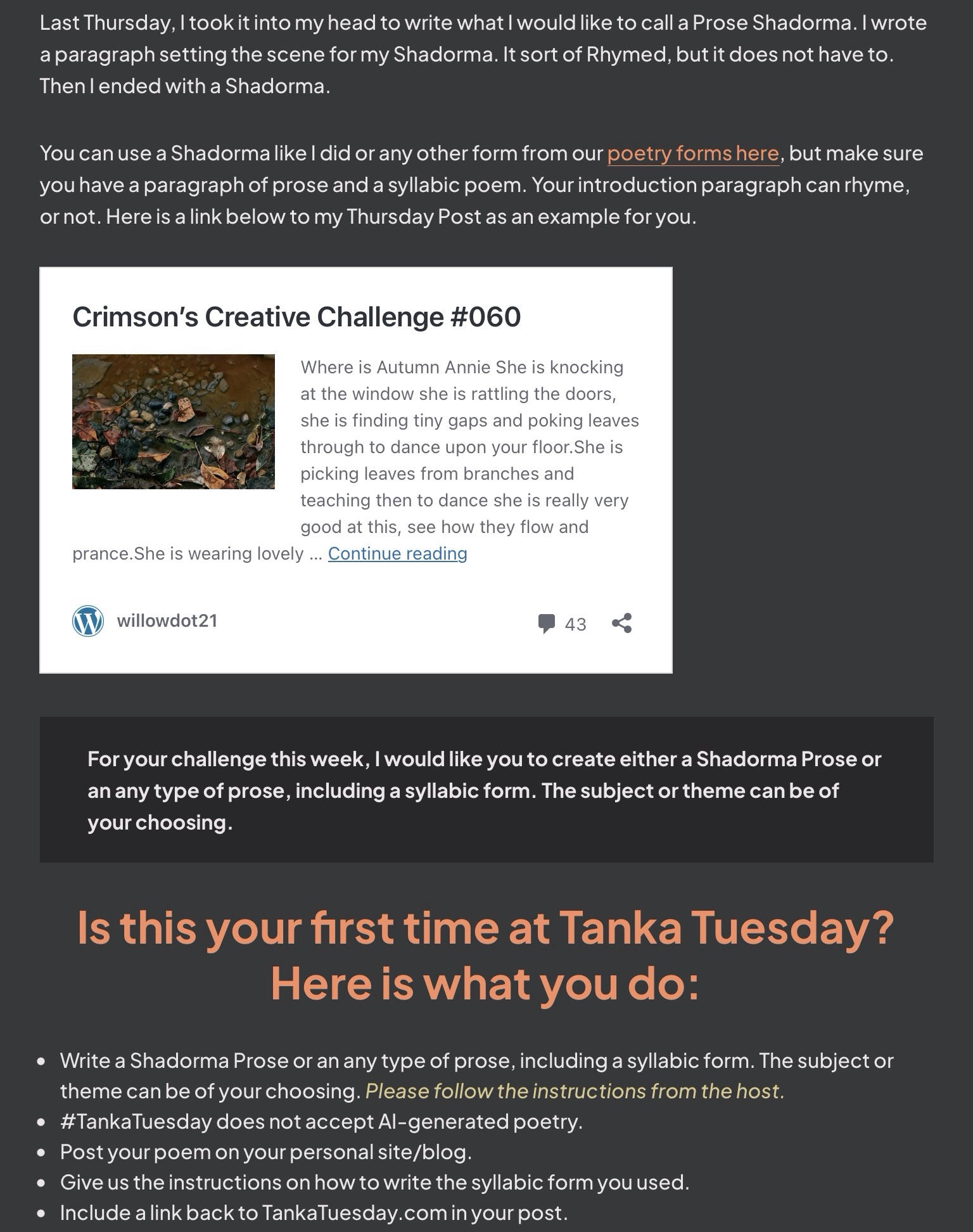 #TankaTuesday Poetry Challenge No. 39, Shadorma Prose, 18/11/2025