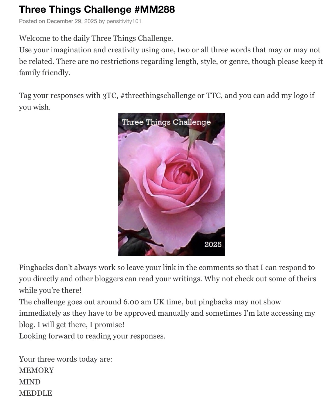 3TC 12-29-25 December 29, 2025 by rugby843, posted in Uncategorized *** WDYS: 12-29-25 The foggy scene meddles with an unpleasant memory in my mind, thoughts once forgotten and then the vision clears. A new journey begins, the past is left behind and the future is bright. *** What do you see # 321- 29 December 2025 https://pensitivity101.wordpress.com/ Click to email a link to a friend (Opens in new window) Email Like Loading... Related