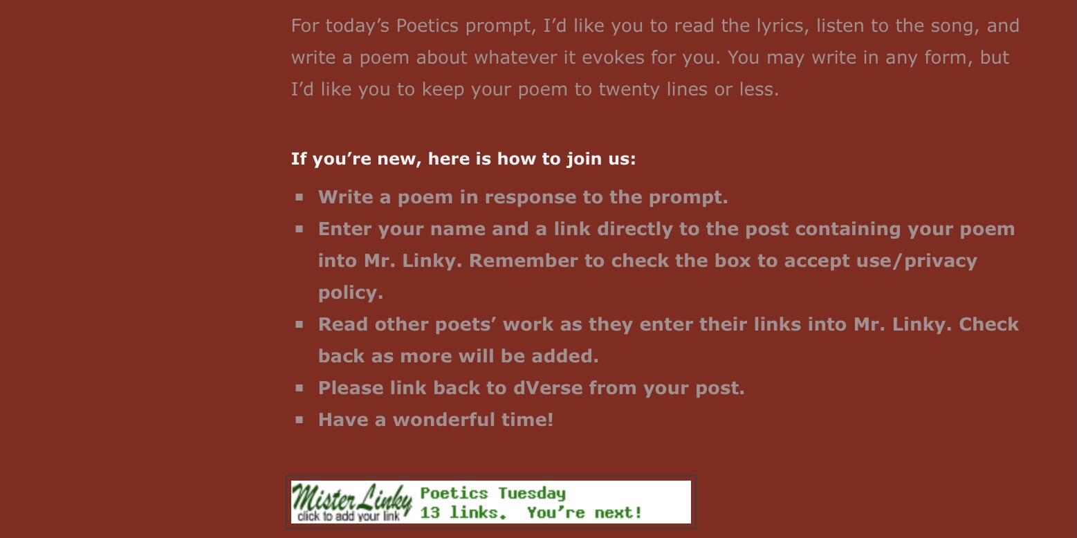 dVerse Poets January 13, 2026 by rugby843, posted in Uncategorized *** occasionally musicians visit a temporary respite from prison routine a needed solace for some *** Folsom Prison Blues Click to email a link to a friend (Opens in new window) Email Like Loading... Related