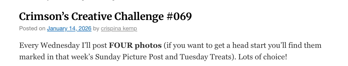 CCC2 – 1-18-26 January 18, 2026 by rugby843, posted in Uncategorized *** halves or thirds world is divided nature shows *** Crimson’s Creative Challenge #069 Email a link to a friend (Opens in new window) Email Like Loading... Related