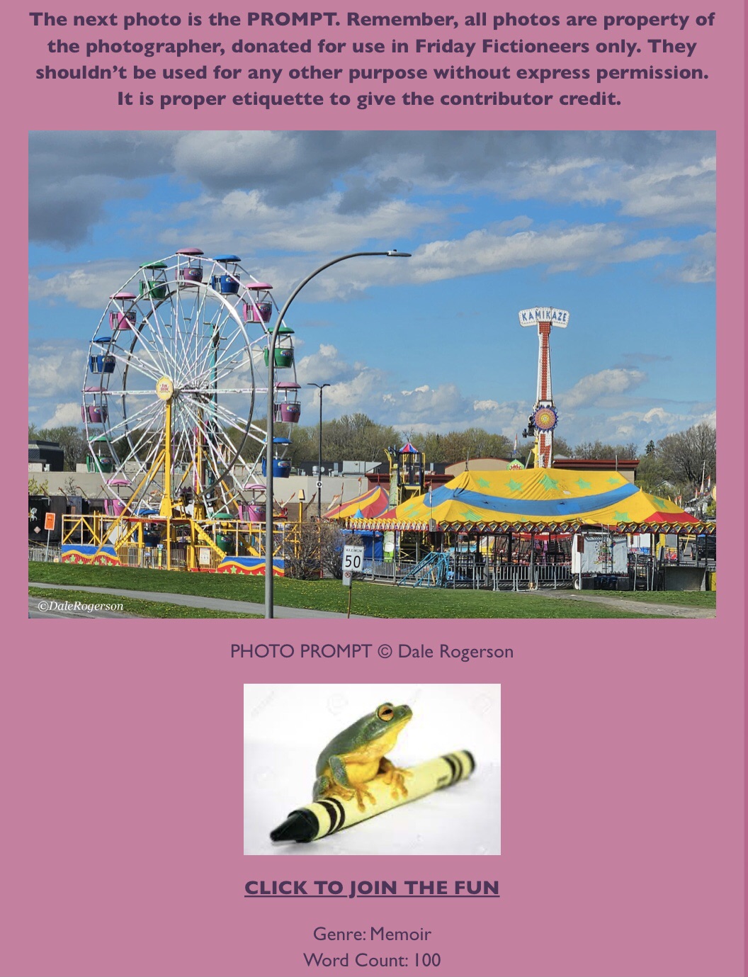 After the Ferris wheel, Julie insistently pulled at Joe’s arm. Finally they strapped themselves in and after two wild jerky rounds, Julie threw up in Joe’s lap where she was hiding.
