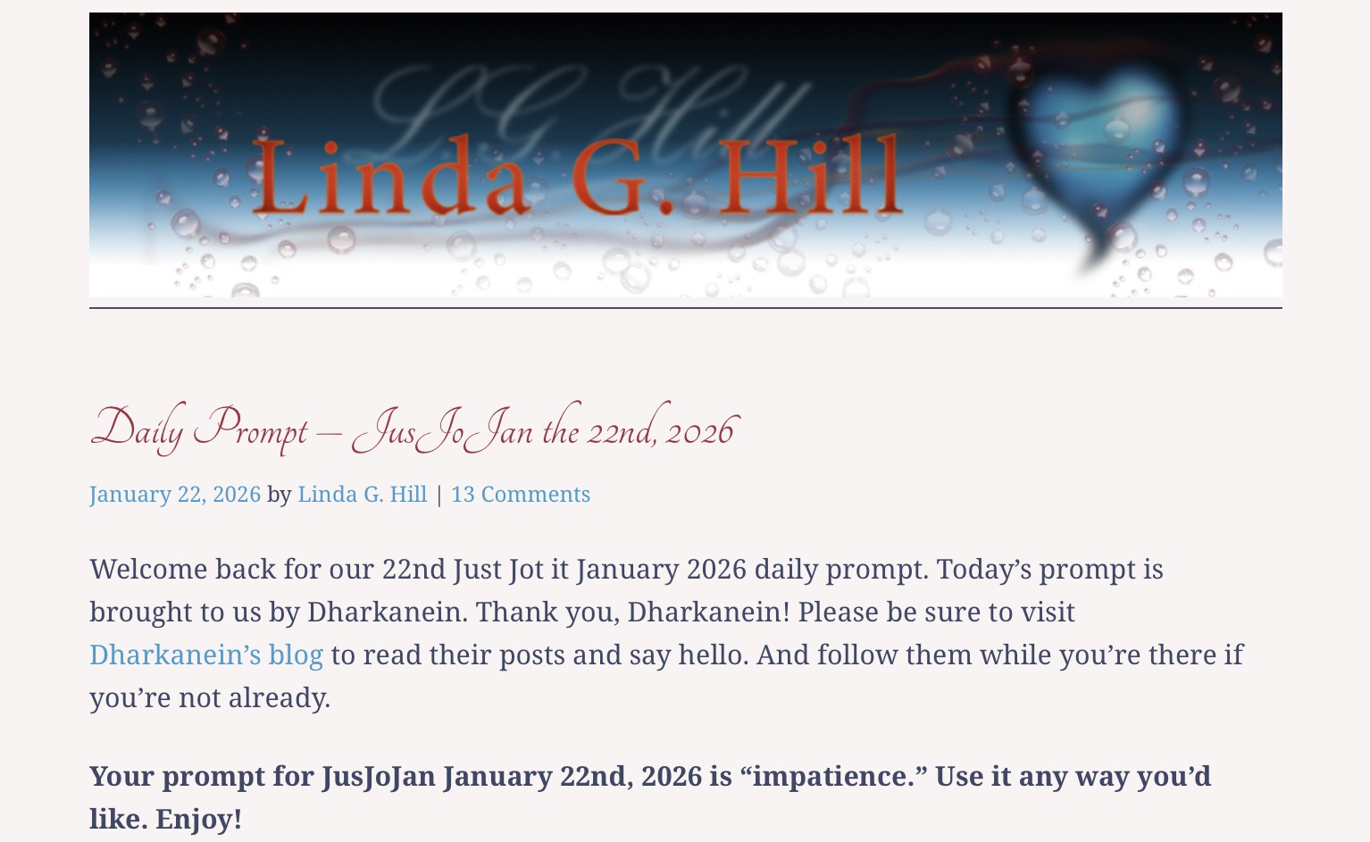 Impatience, well I could write a book on that concept. As a young mother my patient demeanor lasted until my third child under five came along. Somewhere in the line my childhood dream of leading the life of Cinderella, I didn’t realize no dwarfs or magic brooms were included. I still wanted everything to be perfect and that’s when the ugliness of impatience came to visit like an unwanted guest. Now that I’m old, I realize how much frustration I suffered being impatient – too much! Life slips by quickly. My advice now is just go with the flow. Everyone including yourself will be happier.