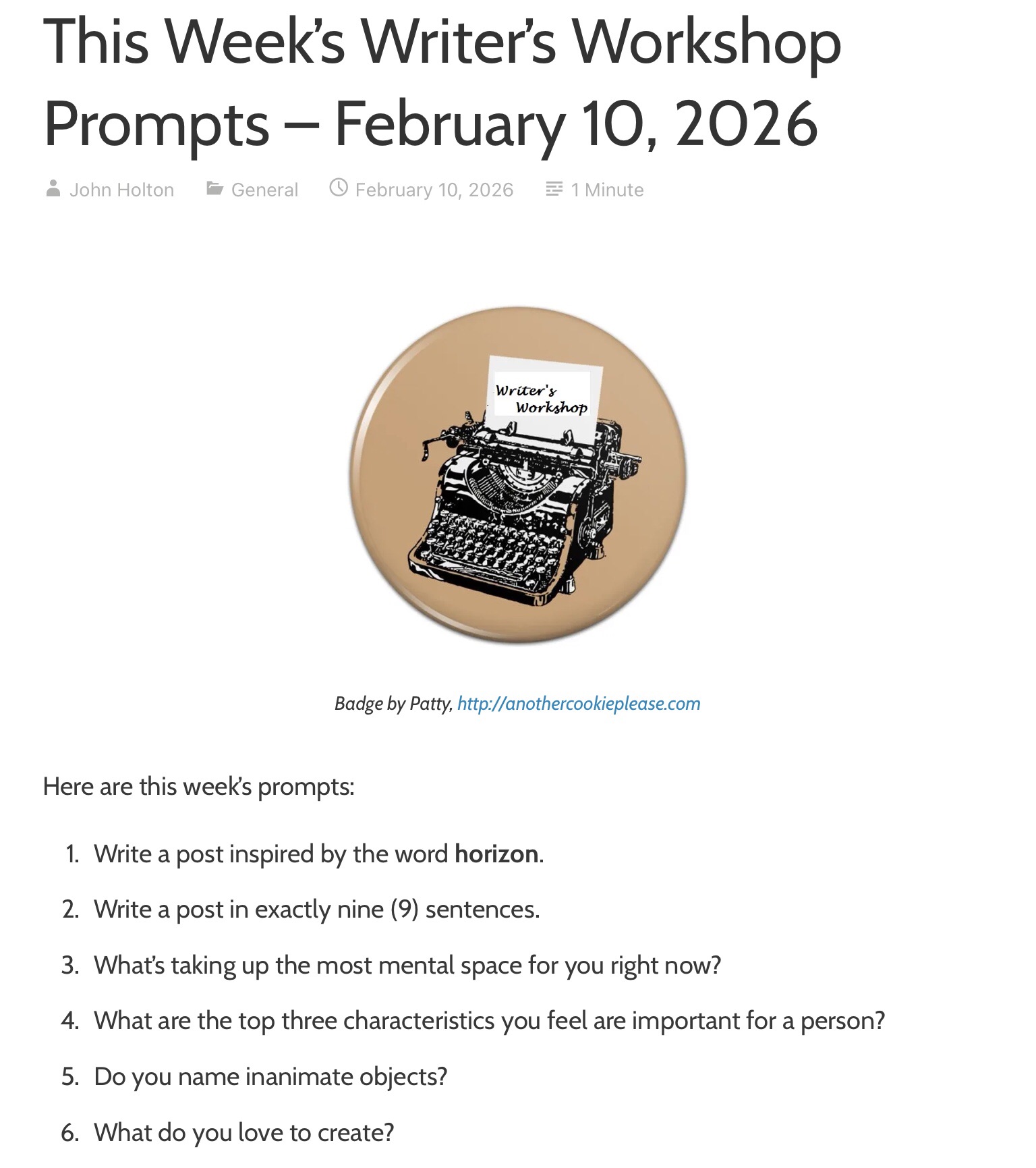 The Writer’s Workshop February 10, 2026 by rugby843, posted in Uncategorized *** 4. Honesty, loyalty, sense of humor *** This Week’s Writer’s Workshop Prompts – February 10, 2026 Email a link to a friend (Opens in new window) Email Like Loading... Related