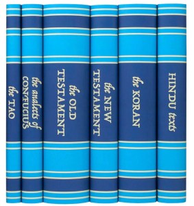 The image is only a sample of religious texts, most agreeing although each claiming to be the original form of religion.