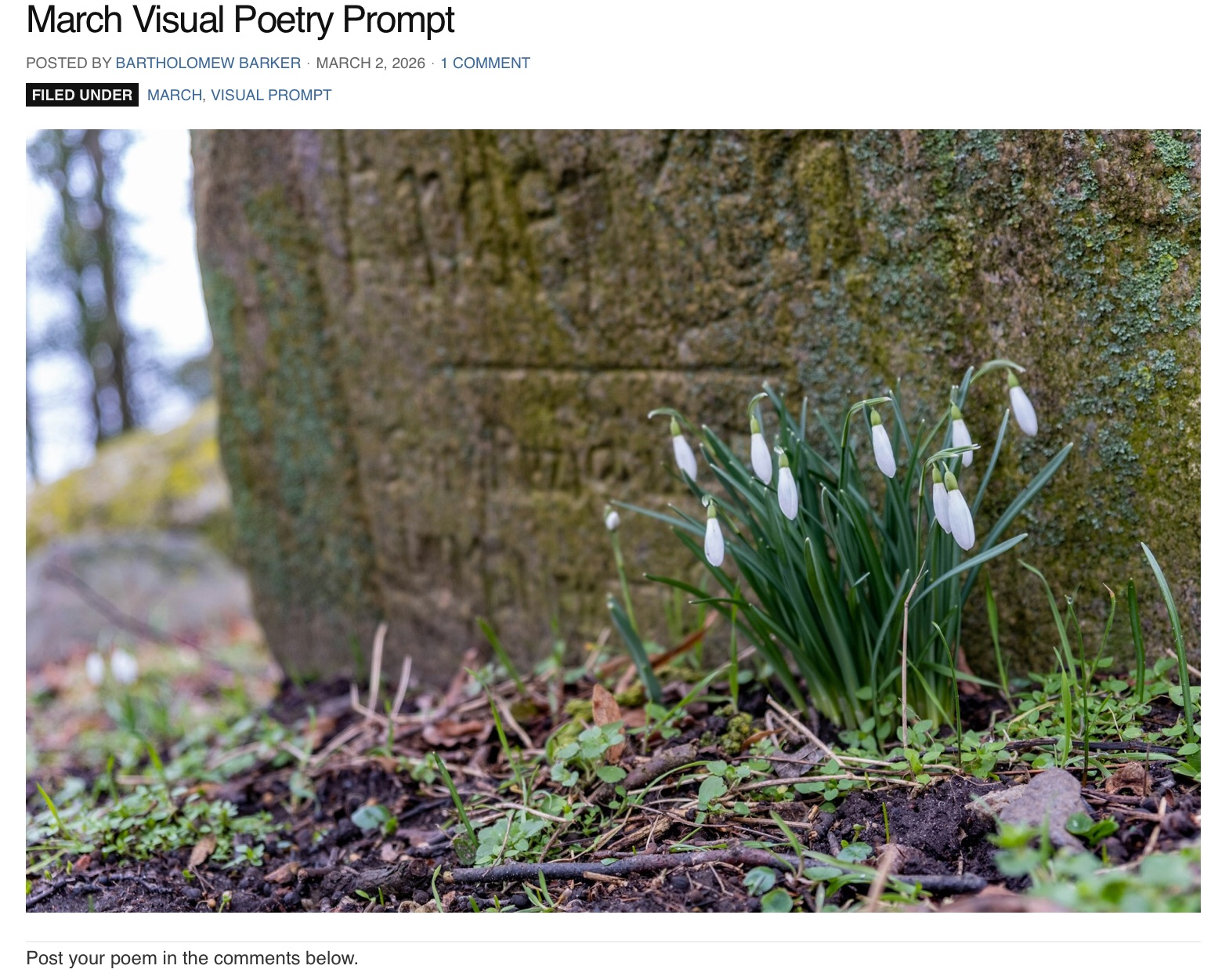 Living Poetry March 2, 2026 by rugby843, posted in Uncategorized *** bending fronds sad petals mourning fine gesture *** March Visual Poetry Prompt Email a link to a friend (Opens in new window) Email Like Loading... Related