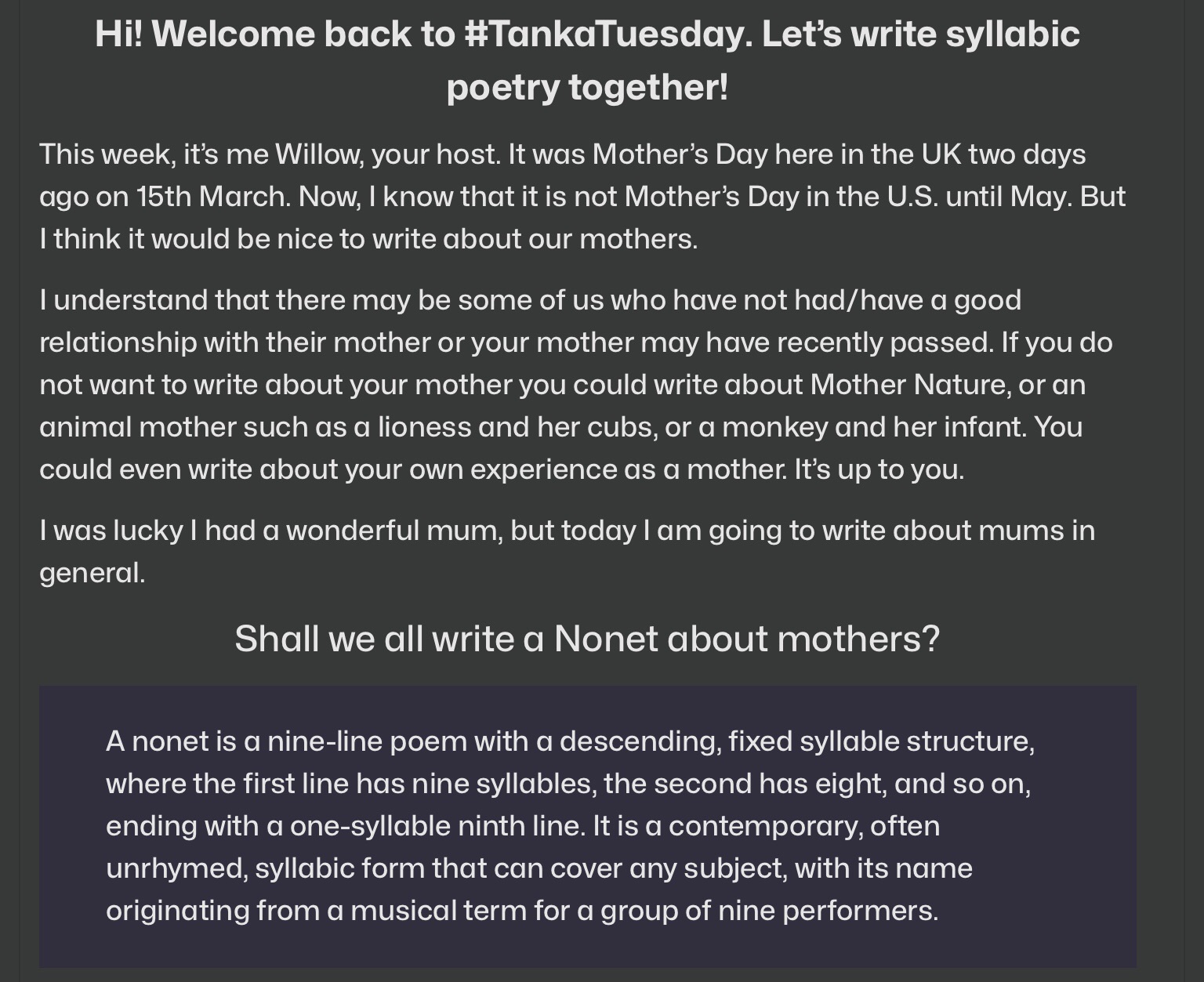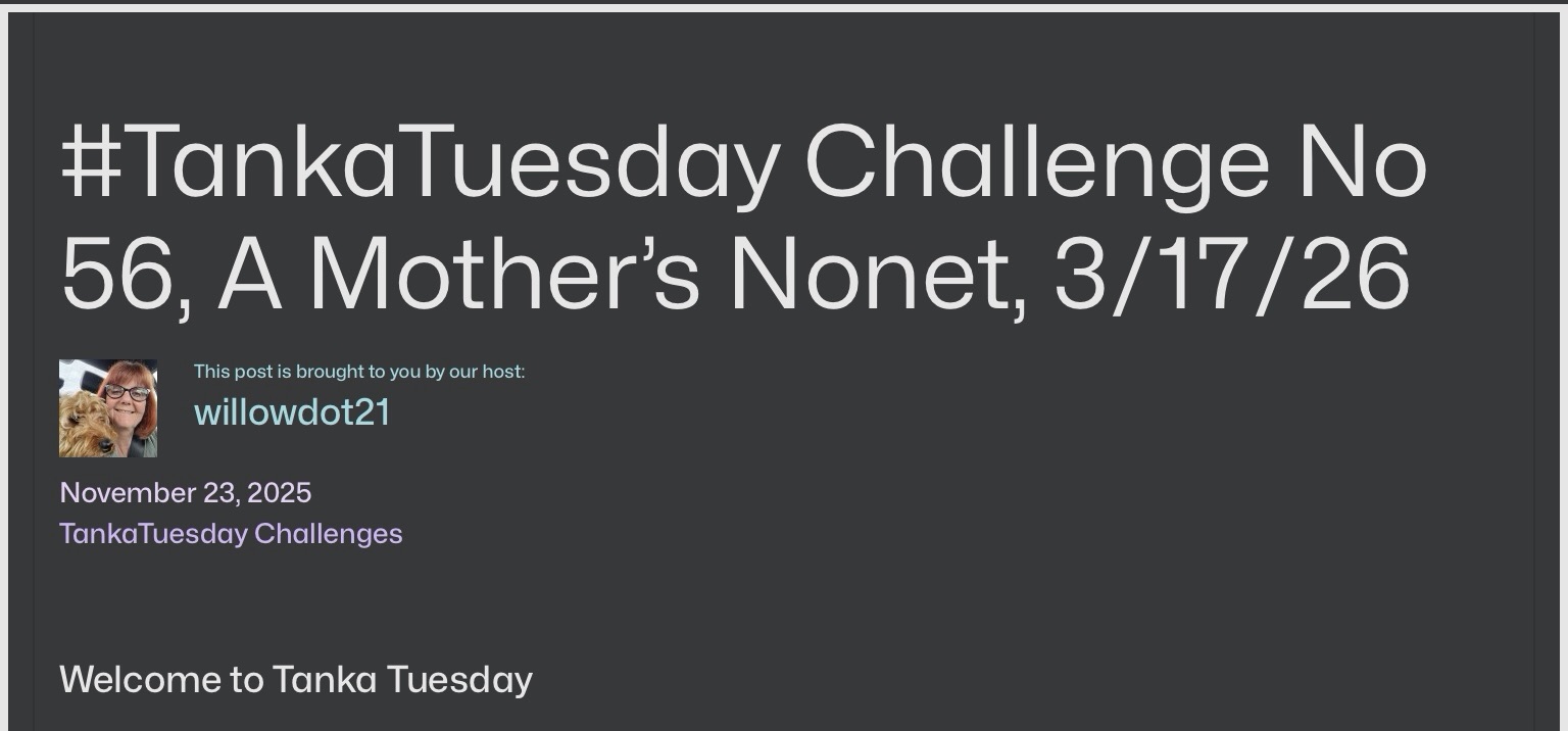 #TankaTuesday Challenge No 56, A Mother’s Nonet, 3/17/26