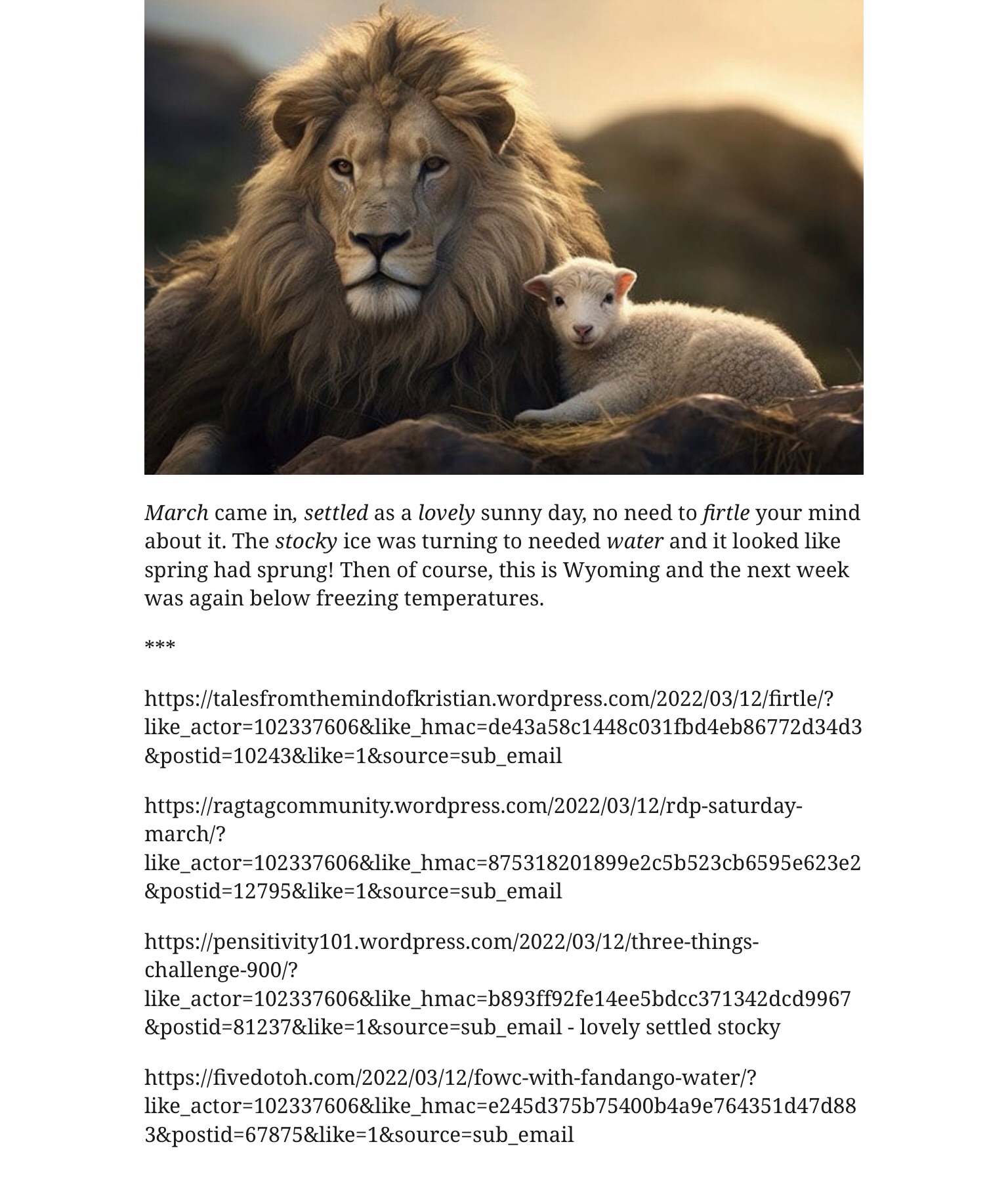 Fandango’s Flashback Friday March 28, 2026 by rugby843, posted in Uncategorized 3TC – Lion or Lamb 3-12-22 *** Fandango’s Flashback Friday — March 27th Email a link to a friend (Opens in new window) Email Like Loading... Related